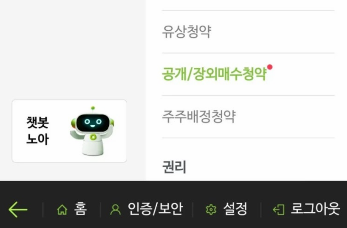 메뉴에서 공개 쟁외 매수청약을 선택해 주세요. 만약 찾는것이 어려우면 검색창에 장외라고 입력해 주셔도 찾으실 수 있습니다. 공개/장외매수 청약 클릭