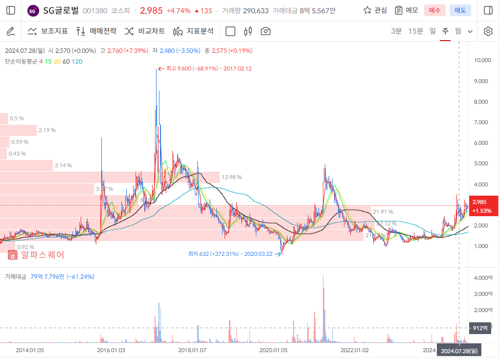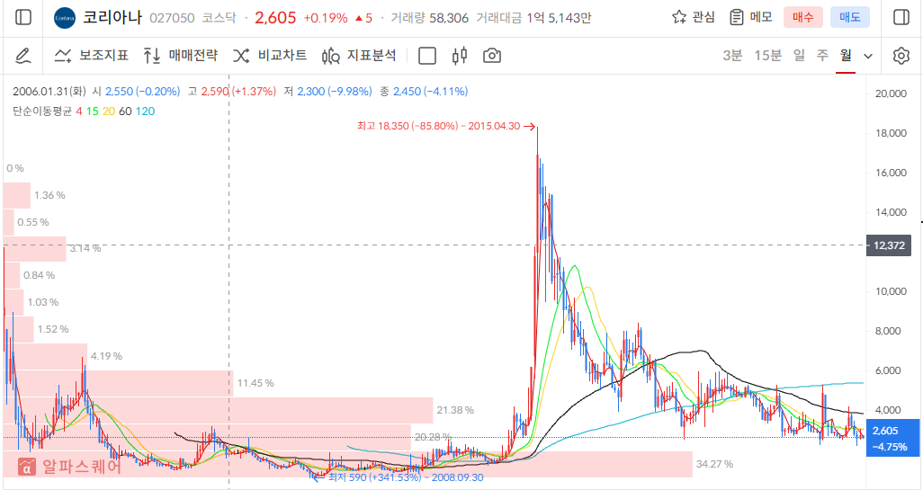 주가를 확인해 보니 2605원으로 역사상 최저점에 근접. 주가는 매력적이나 물려있는 매물들이 엄청 많을거 같음.