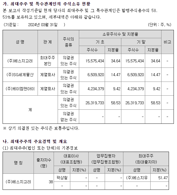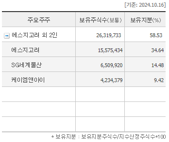 주주현황을 보면 에스지고려외 2인이 유통주식에 60%정도를 가지고 있음.