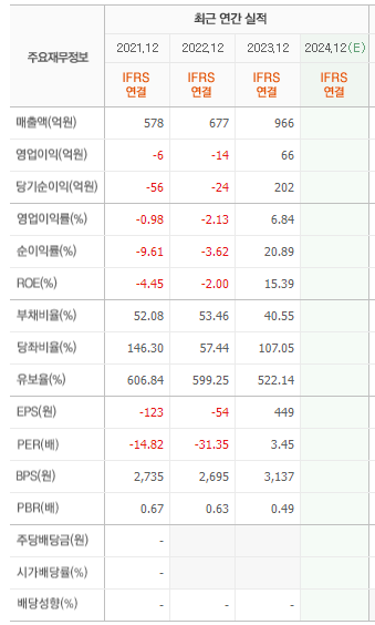 기업의 재무구조 매출액이 2023년도에 많이 늘어나면서 영업이익이 흑자로 돌아섰지만, 그동안은 적자!! 부채비율이 40%정도로 양호하고, 유보율도 쏘쏘~~