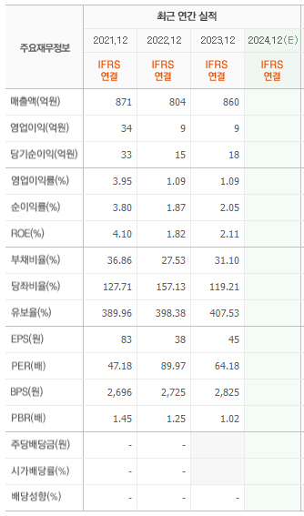 재무구조를 살펴봄. 매출액도 그리 크지않고 당기순이익이 매우 작음. 대신 부채비율이 낮고 유보율도 쏘쏘~ 뭐 특별할 거 없는 기업임. 단 PER이 64배로 엄청 높게 설정이 되어 있음. 주가가 이렇게 내려갔는데도 고평가 되어 있는 수준. 그만큼 당기순이익이나 영업이익이 안나오는 회사임..