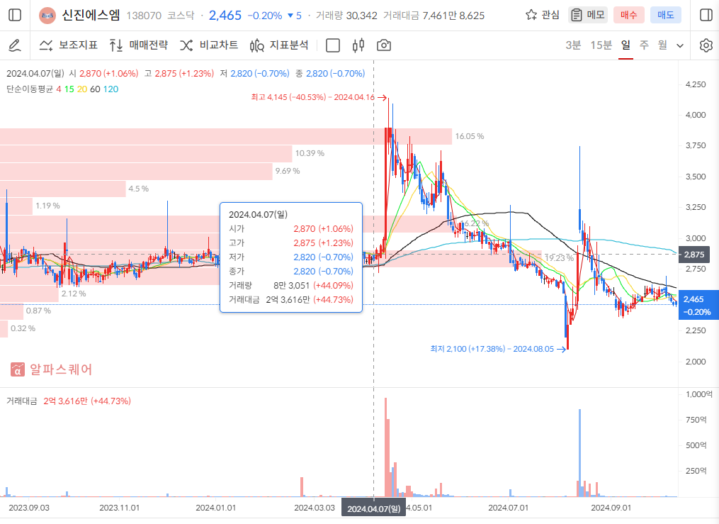 2024년 4월 총선에서 거래량은 1000억 정도 최고점이 터지면서 주가가 단기간에 급등함. 2800원에서 4100원까지 1~2주정도 되는 짧은 기간에 상승 하는 모습을 보이면서 김동연 관련주라고 시장이 인정을 함!!! 대략 67% 상승률을 기록!!