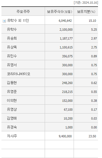 대주주 지분율을 보니 유학수외 11인이 15%의 지분을 가지고 있는데,,, 대주주 지분율이 매우 낮은 상황이고 시장에 유통되고 있는 주식은 800억 정도로 매우 많은 편.. 작전하기는 어려울 거 같아 패스!!