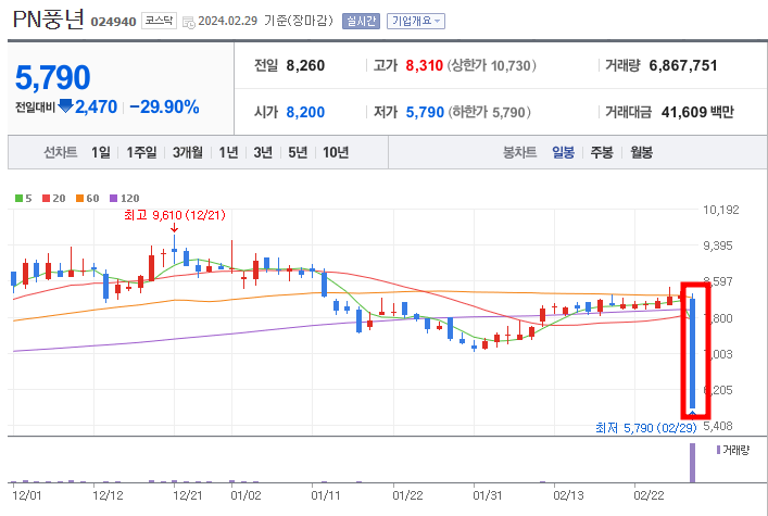 2024년 2월 29일 주가가 하한가를 기록하면서 엄청난 하락을 함.