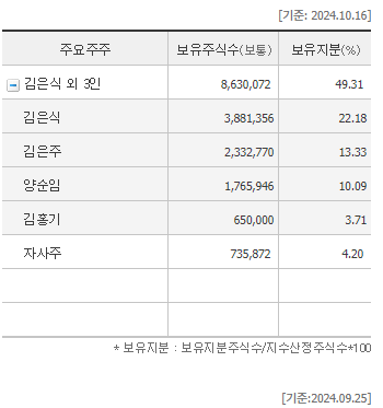 주주구성을 확인해 보니 김은식 외 3인이 50%지분을 보유하고 있는 기업!! 시가총액 400억중에 절반인 200억 정도를 보유하고 있으니 작전하기 딱 좋은 주식 사이즈긴 한거 같음..