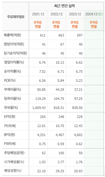 기업 재무구조를 살펴보면 매출액은 600억 수준을 유지하고 당기순이익은 매년 40억 정도로 늘지도 줄지도 않는 상황.