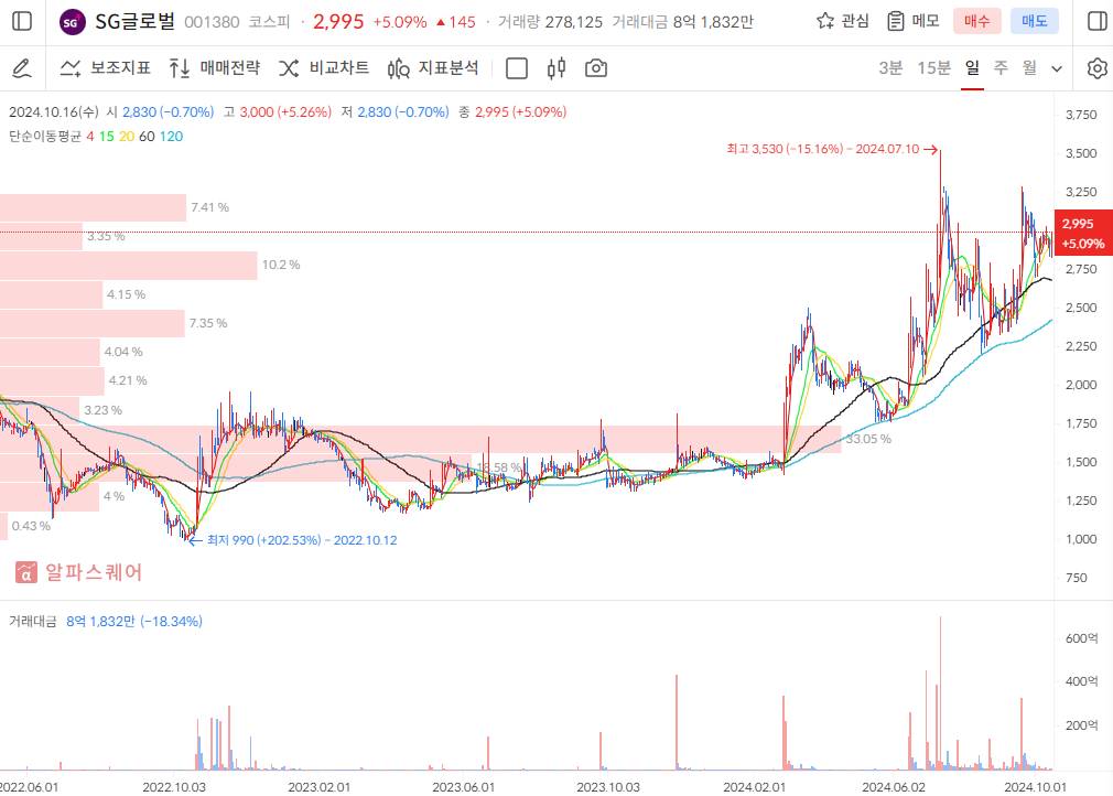 현재가 2995원으로 주가가 상승추세이며 이평선이 정배열되어 있음. 시가총액은 1000억원대 규모로 그리 크지 않은 수준.