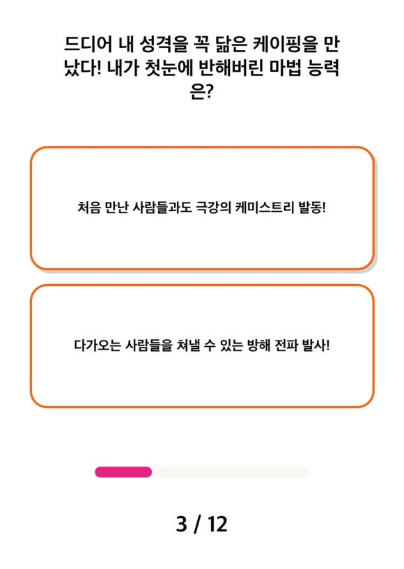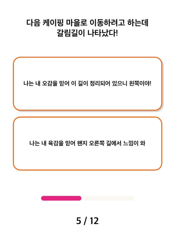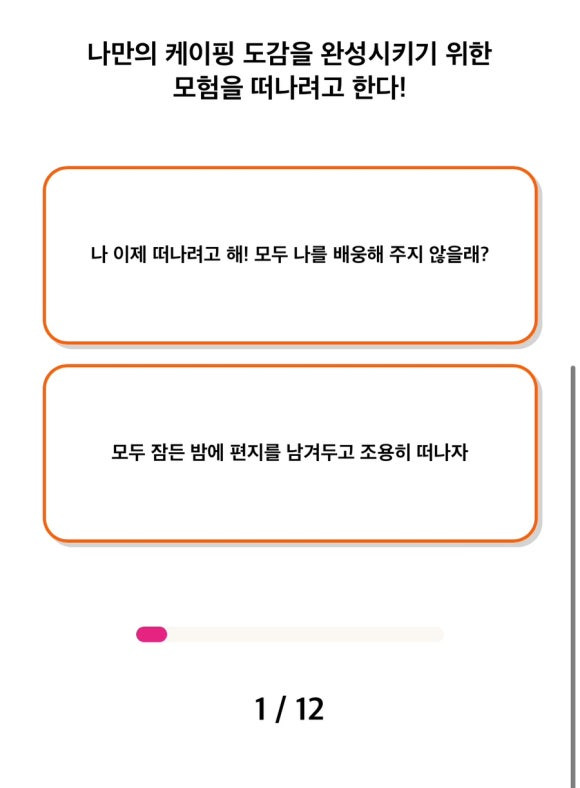 핑도감 테스트에서 모험을 떠날 때 어떻게 할 지 묻고있네요... 누가 알아봐주는게 좋긴 하거든요 사실!! 제가 여렸을때는 과연 어땠을까요?? 조용히 나가고 싶기도 했을거 같긴 합니다.
