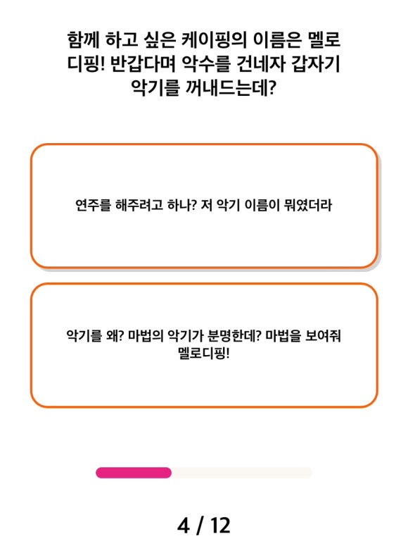 4. 함께 하고 싶은 케이핑의 이름은 멜로디핑! 반갑다며 악수를 건네자 갑자기 악기를 꺼내드는데?