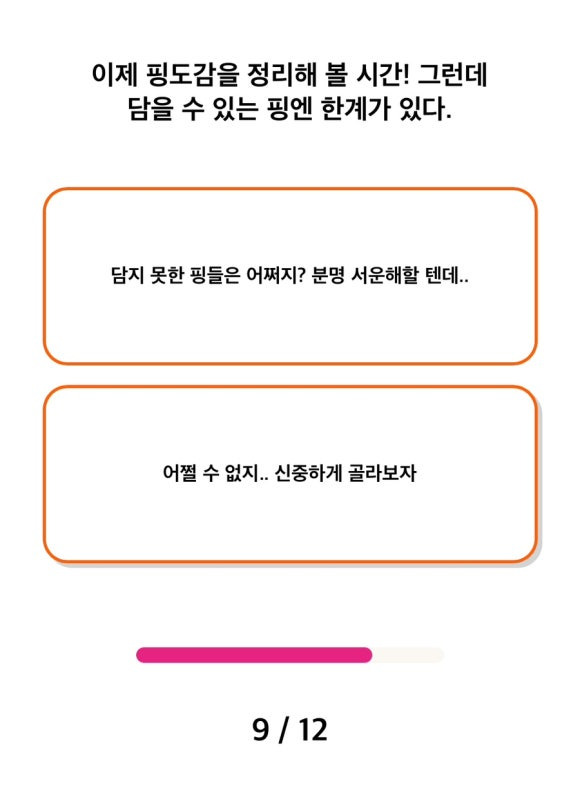 나만의 핑도감 테스트를 해보면 질문이 총 12개 정도 나오는거 같아요. 테스트를 마치면 각각의 결과가 16가지로 나오며 MBTI와 매칭이 되는 점이 재미있습니다. 각 질문에 대해 A와 B 중 선택하는 형식입니다.