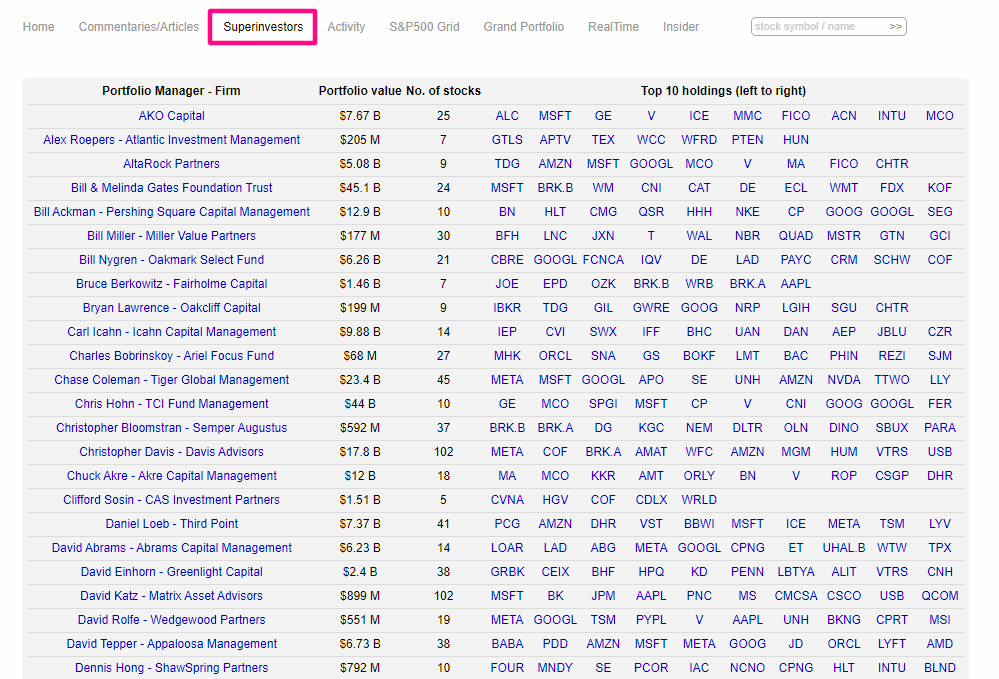 투자 대가들이 어떤 주식을 사고 파는지 그들의 포트폴리오에 담긴 주식의 목록을 파악할 수 있는 사이트입니다. 아래 바로가기링크를 클릭하면 해당 사이트로 이동할 수 있어요. 운영자산 1억달러 이상 자산을 운영하는 기관은 자신의 운영 현황 보고서를 매년 제출하도록 요구하는데요. 이런 포트폴리오 정보를 무료로 로그인 없이 누구나 확인할 수 있다는 점이 매력적인 사이트 입니다.