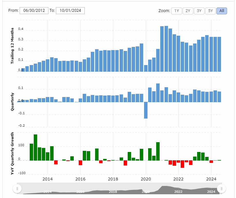 아래에서 Financials 탭 즉 재무탭을 클릭하면 기업의 매출 영업이익 순이익과 같은 다양한 정보를 확인할 수 있습니다. 스크롤을 오른쪽으로 이동하면 2023년 12월부터 2011년 데이터까지 데이터를 확인할 수 있어요.