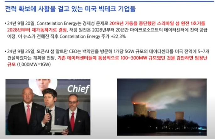 AI가 발전할수록 전력 수요가 늘어날 것으로 예측이 됩니다. 따라서 최근 소형원전, 전력관련 유틸리티 기업들의 주가가 올르고 있어요. 특정 에너지 섹터에 에너지가 주목되는게 아니라 미국 에너지 전반적인 영역에 고루 투자가 이뤄질 거라 예상됩니다. 2025년에도 여전히 AI가 가장 유망한 투자 섹터가 될 것으로 예상되고 이런 AI를 운영하기 위한 데이터센터를 가동하기 위한 전력 산업에 집중해야 한다고 생각합니다. 미국 전력 수요가 기하급수적으로 늘어날 것으로 예상이 되구요.