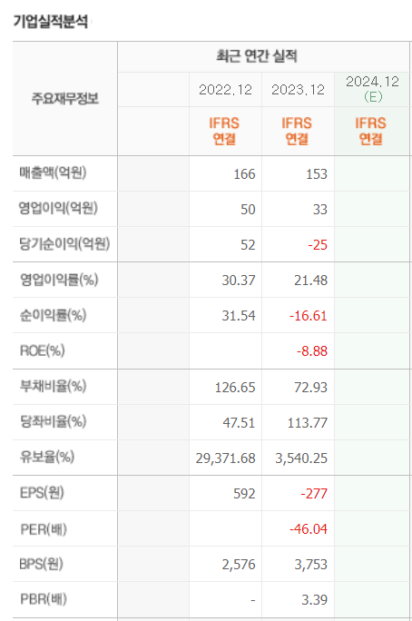 매출액은 2023년 12월 기준 153억원을 기록하고 있어 자산대비 25% 정도의 매출액을 구성하고 있어요.