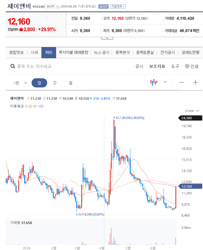 반도체 관련주 제이엔비가 오늘 장중에 상한가를 기록했어요. 제이엔비는 작년 11월에 코스닥에 상장한 반도체 장비 기업입니다. 2002년에 설립되어 2023년 11월, DB금융스팩 9호와 합병하여 스팩소멸합병방식으로 코스닥에 상장이 된 기업이에요. 얼마전 엔비디아를 뛰어넘는 인공지능(AI) 반도체를 삼성 28나노 공정을 통해 개발했다는 소식에 영향을 받아 주가가 크게 상승한 바로 그 기업입니다.
