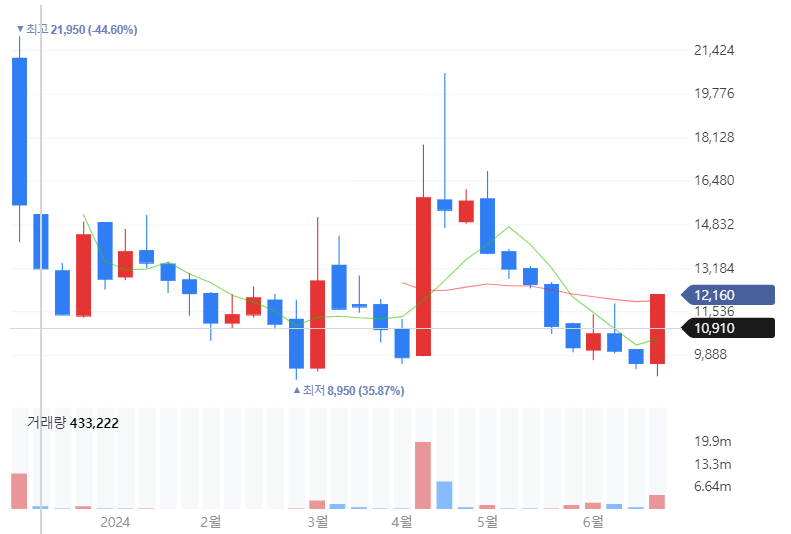 현재 주가는 12,160원에 형성이 되어 있어요. 그리고 현재 주가는 저점 대비 30% 상승한 지점에 위치해 있습니다. 52주 최고가는 22,500 원 이고, 52주 최저가는 8,950 원 입니다.