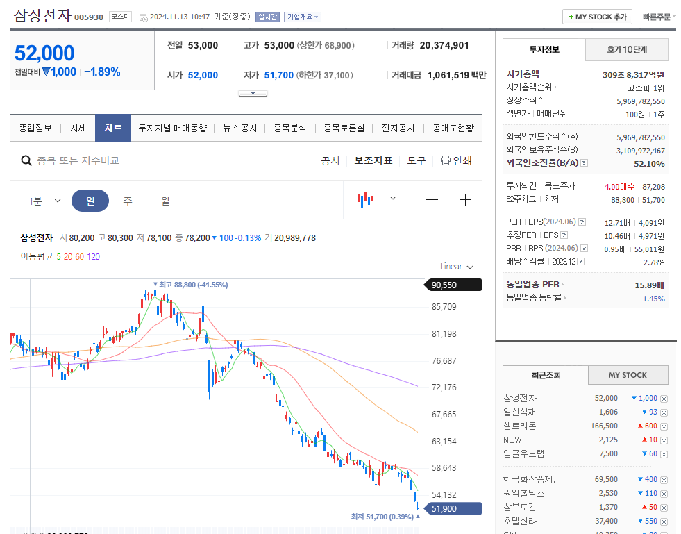 삼성전자 주가가 51,800까지 빠지고 있는 상황입니다. 왜 이런일이 계속되고 있는걸까요? 이번 포스팅에서는 삼성전자 주가 바닥이 언제일지, 언제 매수를 하면 좋을지 정리해 보도록 할께요.