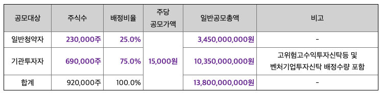 - 최소 청약 주수: 10주, 청약 증거금 75,000원 (공모가 15,000원 × 50%)
