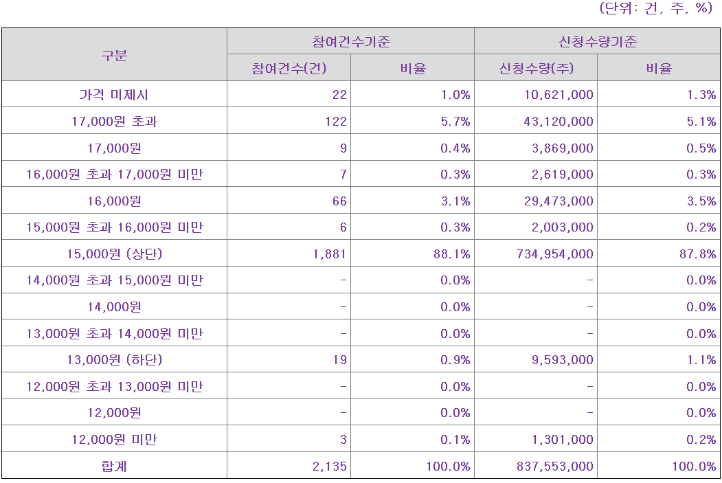 - 공모가 밴드 분석: 희망 공모가 밴드는 13,000원~15,000원이었는데, 약 88%의 기관이 밴드 상단인 15,000원을 제시했습니다. 결국 공모가는 15,000원으로 확정되었어요.