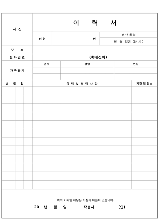 이력서 양식의 주요 내용은 다음 사항이 포함되어 있습니다.