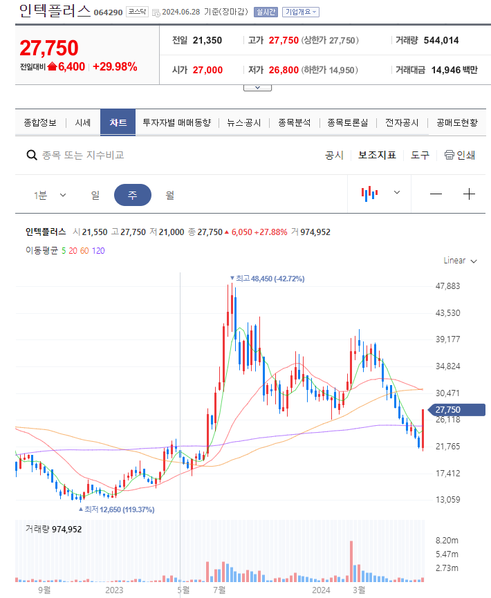 인텍플러스의 월봉차트를 보시면 지난 코로나시절인 2020년부터 주가가 오르기 시작했고, 고점을 찍고 조정을 받다가 60월 봉을 지지면서 올라가다 이번 HBM 관련주로 엮이면서 급등하는 모습을 보여줬습니다. 48,450원 고점을 찍고 다시 조정을 받고 있는데, 현재 한미반도체부터 HBM 관련주들이 반등하면서 인텍플러스의 주가도 반등할 기미를 보여주고 있습니다.