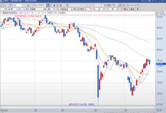 코스닥 지수가 한동안 20일선 아래에서 유지되고 있다는건 시장상황이 좋지 않다라는 이야기...