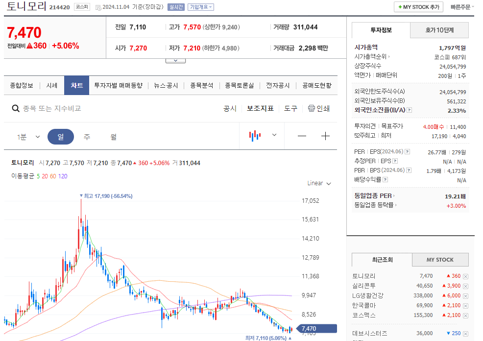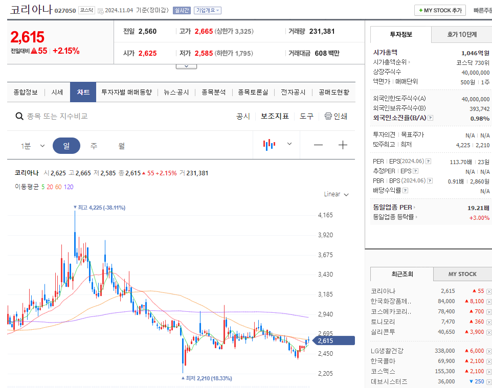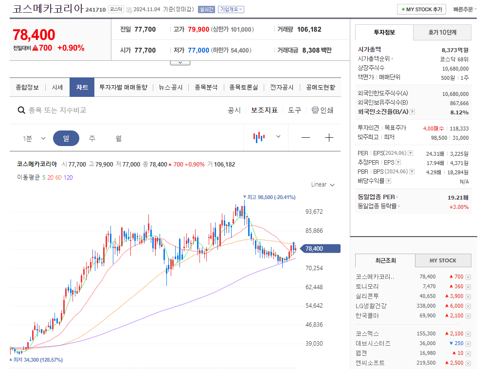 K뷰티 관련종목도 대부분은 움직임은 없었지만 이번 무비자 정책과는 별개로 실리콘투와 한국화장품제조 코스메카코리아 주가는 꾸준히 상승세를 보이고 있어요. 이거 왜 올라가고 있나 조사해 봐야 겠습니다.