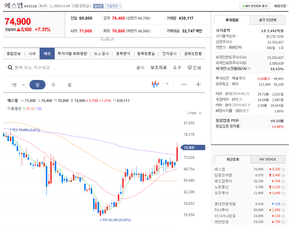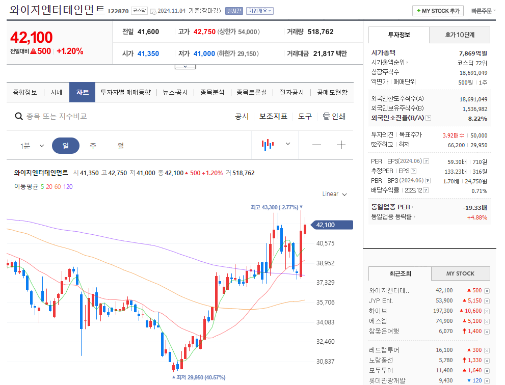여행주 다음으로 엔터주 상승이 돋보입니다. 엔터주에서는 JYP와 에스엠 하이브가 약간의 상승을 보여주었어요.