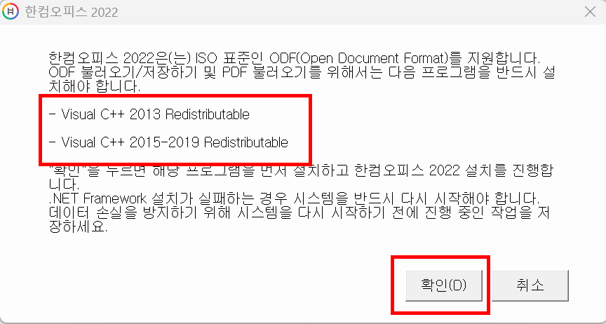 - 필요 구성 요소가 설치되지 않은 경우, 관련 창이 나타날 수 있습니다. 이때는 ‘확인’을 눌러 다음 단계로 진행합니다.
