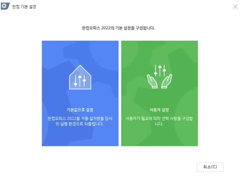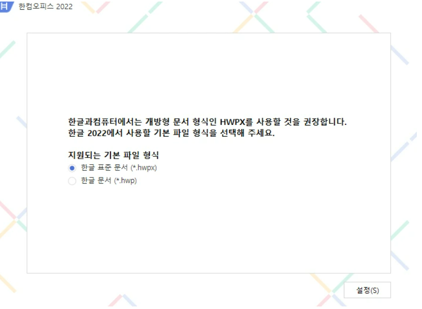 - 설치가 완료되면 파일 형식(HWP, HWPX 등) 선택 화면이 나옵니다. 기본값으로 설정하거나 사용자 정의 설정 가능.
