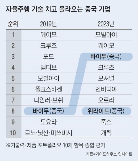 웨이모는 2020년부터 미국 애리조나주 피닉스에서 로보택시를 운영하기 시작해, 사람이 타지 않은 주행 기준으로 로보택시 누적 운행 거리가 4년 동안 3000만km 정도입니다. 반면 중국 기업 바이두는 그보다 늦은 2021년 로보택시 서비스(아폴로 고)를 시작했음에도 누적 운행 거리가 1억km에 달한다고 합니다.
