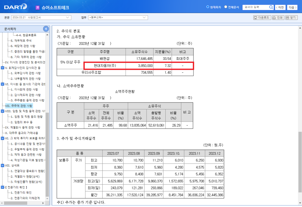 아래 DART 전자공시에서도 확인할 수 있듯이 현대차가 지분 7.32%를 보유하고 있습니다.