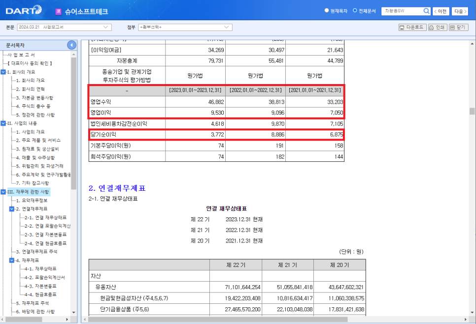 2023년 기준 매출 468억 원, 영업이익 95억 원, 순이익 37억을 기록하고 있는 회사에요.