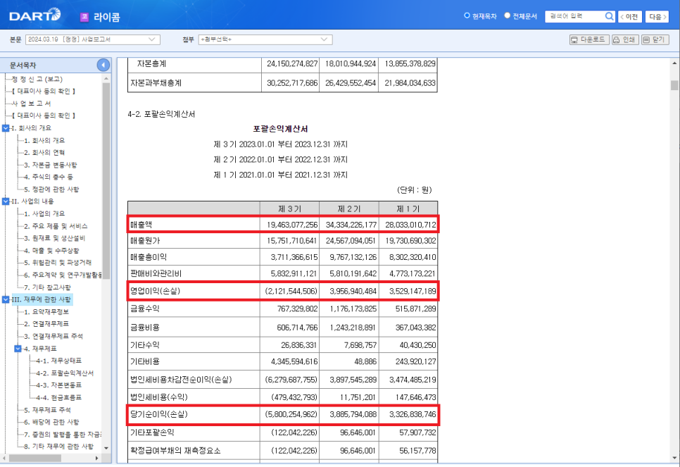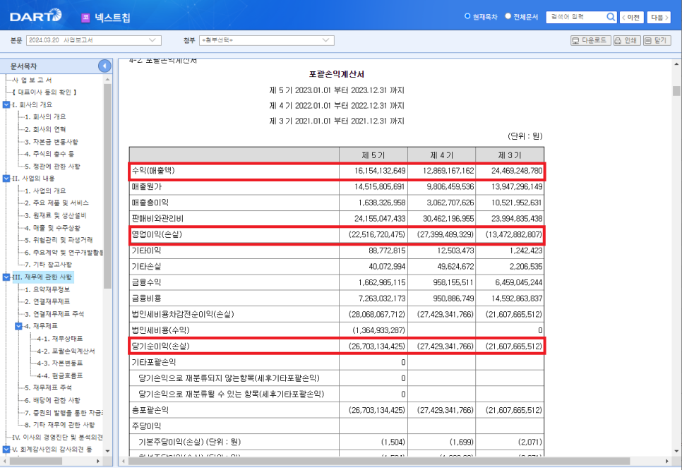2023년 기준 매출 194억 원, 영업이익 -21억 원, 순이익 -58억 원으로 영업이익, 순이익이 적자로 돌아섰습니다.