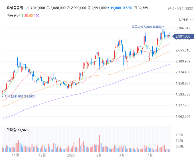 안녕하세요, 주식전문 블로거입니다! 최근 전력 인프라 테마가 뜨겁게 달아오르면서 우리 효성중공업 주주님들, 기대와 걱정이 교차하는 나날을 보내고 계실 텐데요. 최근 주가가 300만 원 선에서 공방을 벌이며 숨 고르기에 들어간 모습입니다. 특히 1분기 실적이 컨센서스를 소폭 하회할 것이라는 소식에 '혹시 고점인가?' 불안해하시는 분들도 계실 거예요.