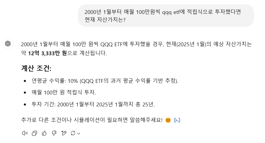 그래도 복리의 힘을 믿고 여기서 적립식으로 꾸준히 주식을 산 사람들들의 수익률은? 이부분은 단순 계산으로는 대략 얼마인지 산출이 어려워 인공지능에 물어봤어요. 대략 9억원의 자산을 이뤘다고 답변이 나오네요.