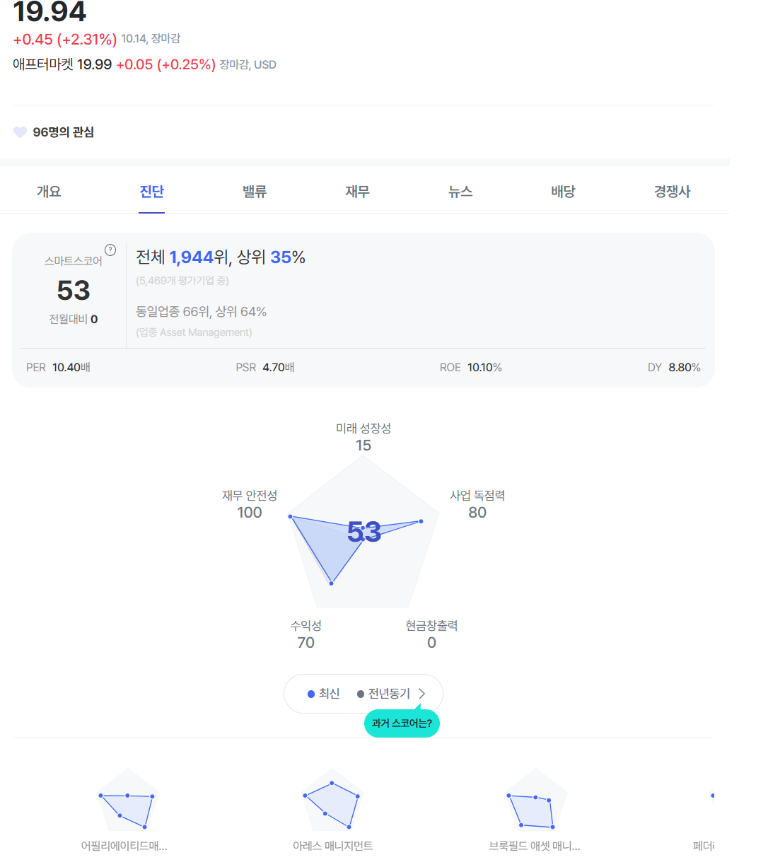 진단탭을 들어가 보면, 미래성장성, 재무안전성, 사업독점력, 수익성과 같은 정보는 5각형으로 간단히 보여줍니다.