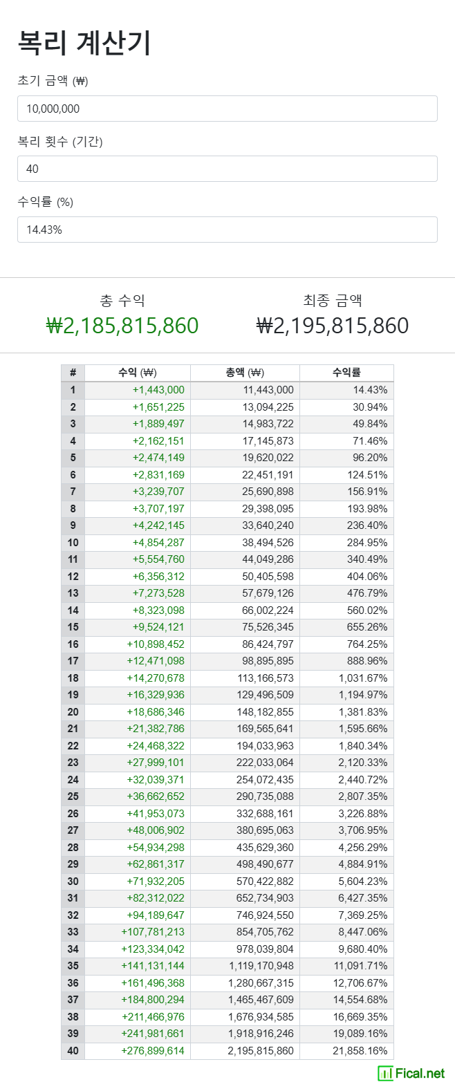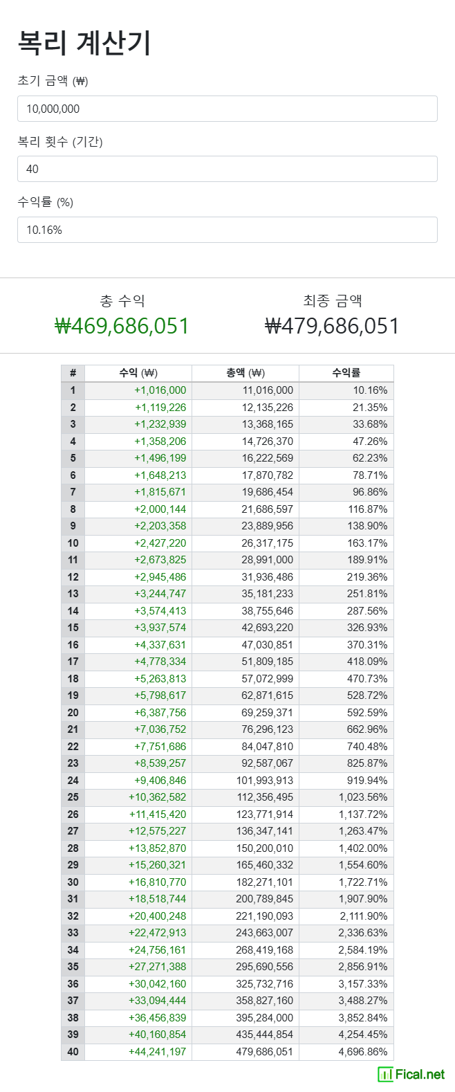 복리 수익률로 1000만원을 40년간 투자했을 때, 차이가 보이시나요?