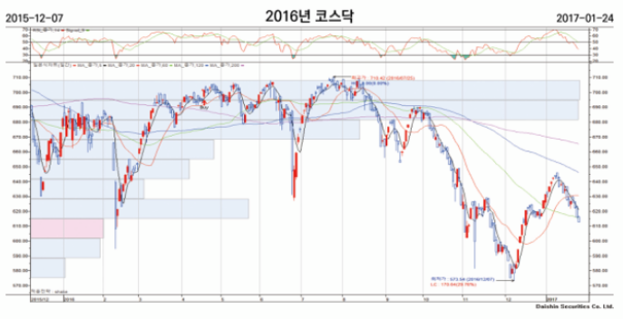 2016년 코스닥 차트를 확인해 보면 7월, 8월, 9월로 가면서 지수가 하방으로 곤두박질 치는 모습을 보여줍니다. 기존 저점을 깨고 내려간 모습이 나타났어요.