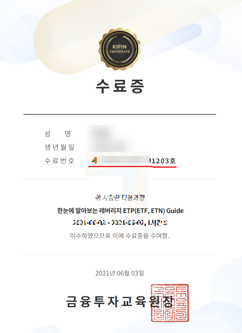 이수하면 수료증이 나오는데수료증에 있는 번호를 나중에 키움증권 파생상품 신청할때 입력하면 레버리지 ETF를 투자하실 수 있습니다.