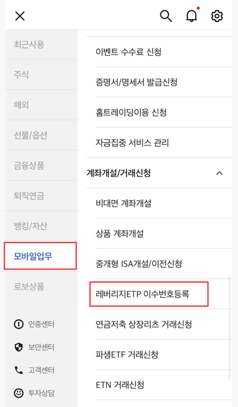 2. 대신증권 MTS에 들어가 모바일 업무 -> 레버리지 ETP 이수번호 등록