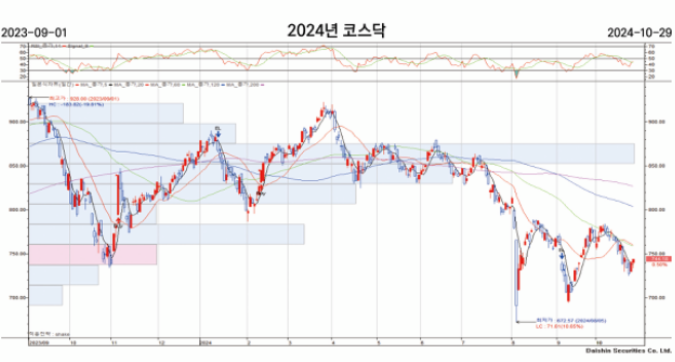 2023년말 2024년 까지 마찬가지로 코스닥 지수가 저점을 깨는 모습이 확인됩니다.
