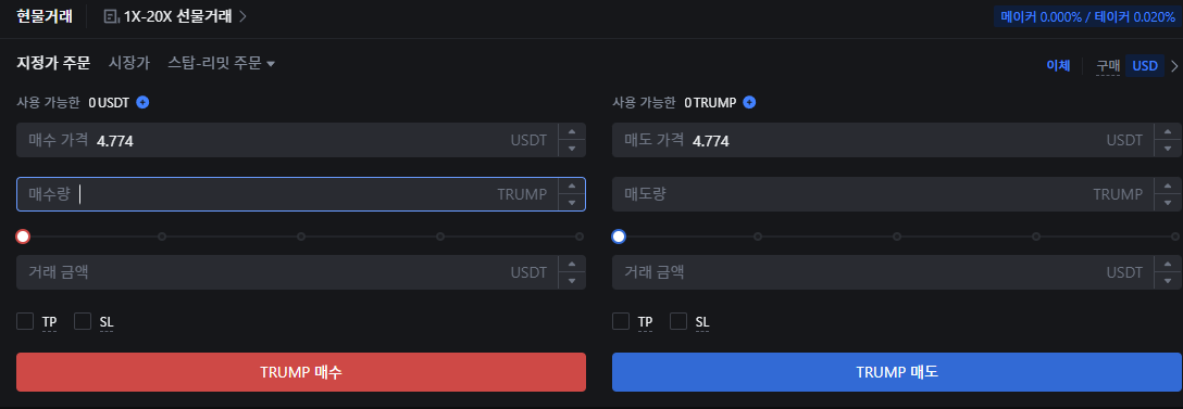 그럼 MEXC에서 마가 코인을 사는 방법에 대해 알아볼께요. 오른쪽 상단 검색창에 TRUMP/USDT 를 입력하면 마가코인 시세 검색이 가능해요!! MEXC 거래소에서 TRUMP를 검색하면 가장 위에 나오는 TRUMP/USDT가 본 포스팅에서 말한 트럼프 밈코인입니다. 참고로 현재 마가 코인 선물거래는 없이 오직 현물 거래만 가능합니다.