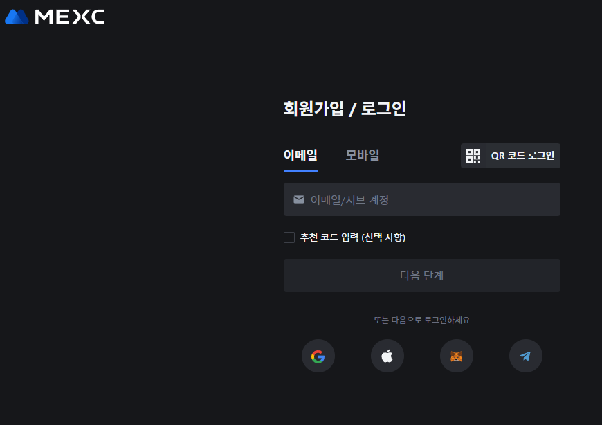 저는 회원가입화면에서 아래 구글 간편 로그인을 선택해서 로그인했습니다. 추천 코드 입력 (선택 사항) 은 입력을 안하셔도 되지만 2VEC9 를 입력하시면 MEXC 거래소 평생 수수료 20% 할인 이벤트를 받아보실 수 있으니 이왕이면 입력하고 가입 하시는 걸 추천드립니다!!
