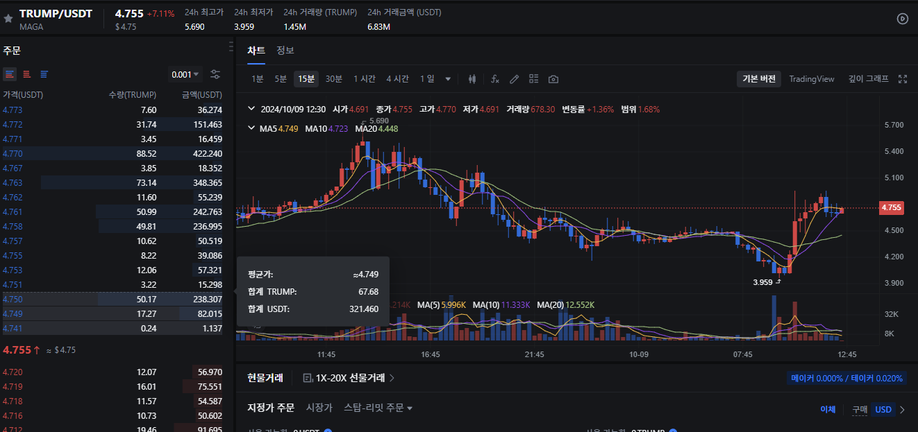 대놓고 일론머스크가 트럼프를 지지하기도 하기 때문에 도지코인 시세도 급등이 예상됩니다. 그중에서 가장 큰 변동성을 보이고 있는 코인은 단연 트럼프 밈코인 MAGA 코인입니다.