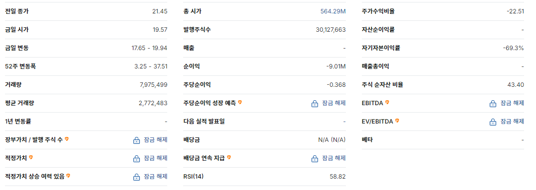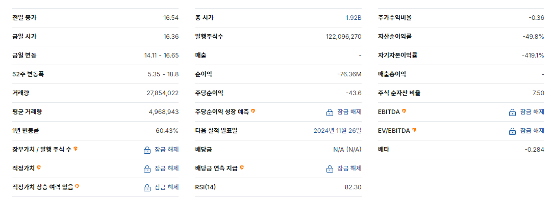 기업 시가총액은 대략 2조원 내외에 형성이 되어 있고,, 현재 주가는 16.54달러로 굉장한 상승을 보여줬습니다. 아직까지 순이익은 마이너스기업이네요.