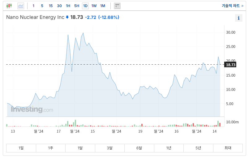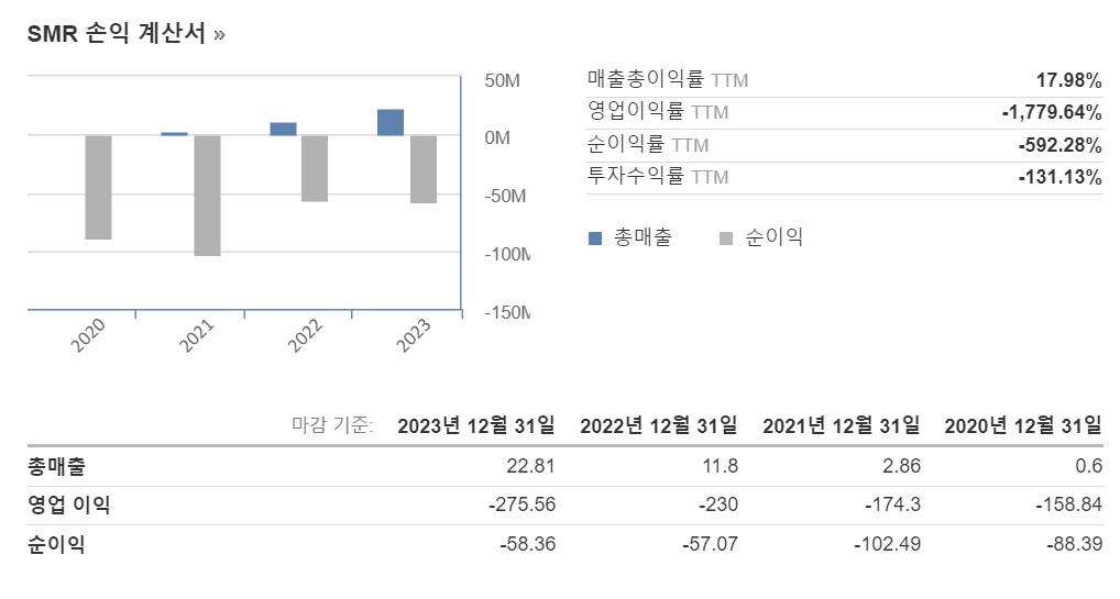 시가총액 5000억원 규모의 소형모듈원자로를 만드는 기업입니다. 회사는 지난 2분기에 7440만달러(약 1015억)의 순손실을 기록했네요. 또 이들이 지금부터 원전을 건설하기 시작해도 최소 5년 이상의 시간이 걸린다는 점도 투자에 고민이 되는 부분 중 하나인거 같습니다. 미래를 보고 투자를 해야 할 기업임에 틀림이 없어요.