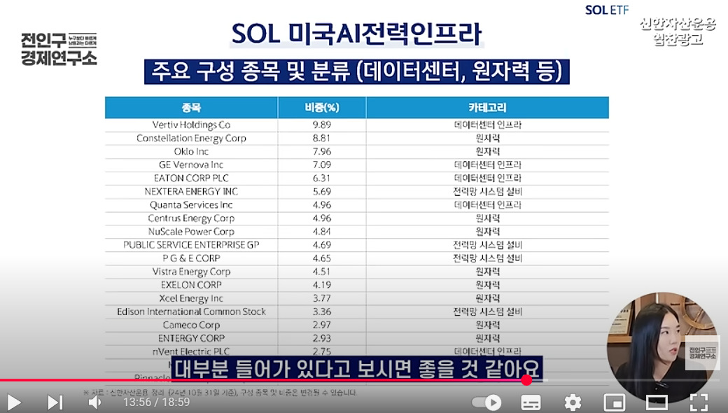 이러한 구성 종목들은 원자력 발전, 데이터센터 인프라, 전력망 시스템 설비 등 다양한 전력 인프라 분야에서 활동하는 기업들로 이루어져 있습니다.